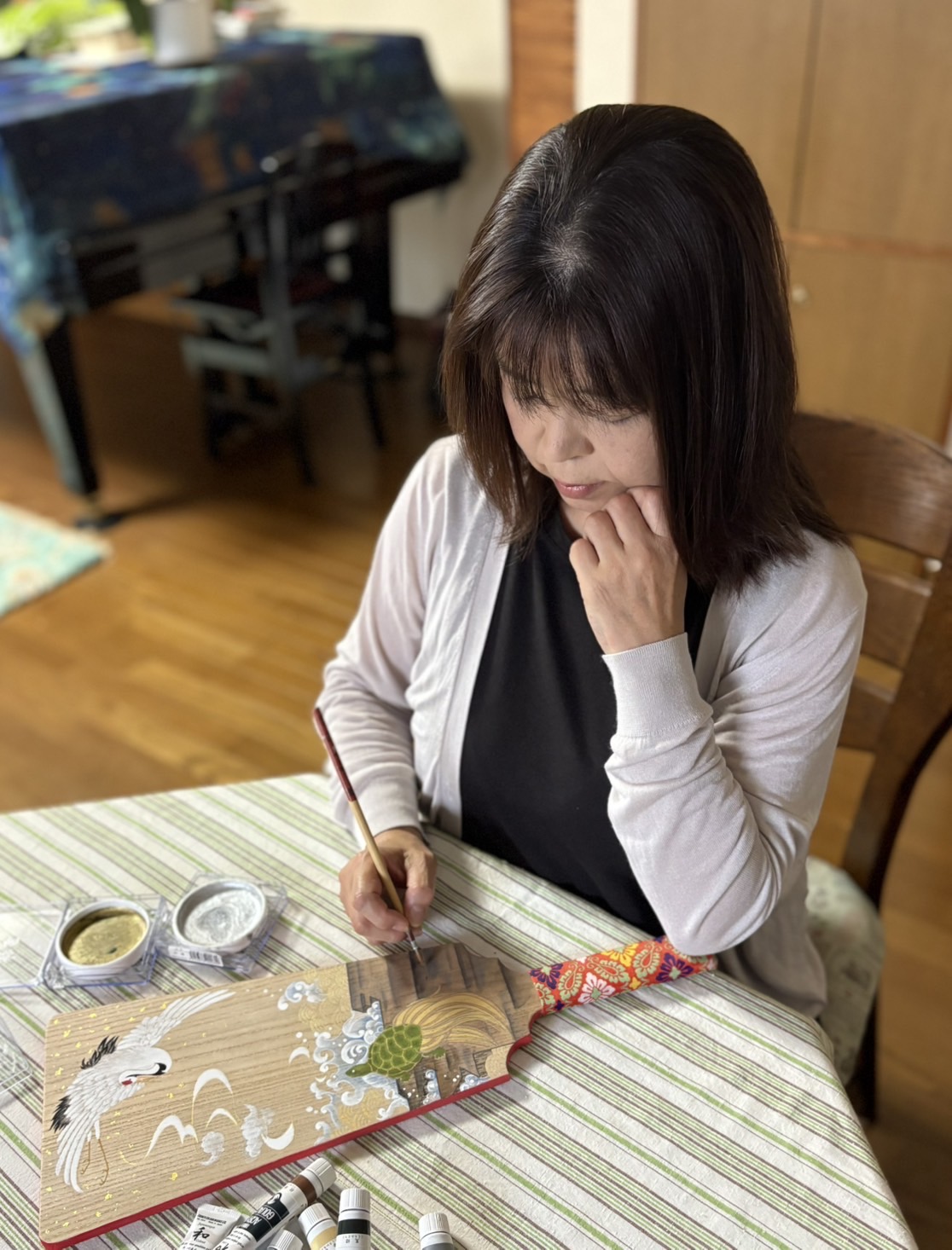 8年前に上生菓子作りを通して日本の繊細な伝統美に深く魅了され、その後、6年前に土田先生にご指導いただき、桐箱絵付けという新たな世界に出会いました。
